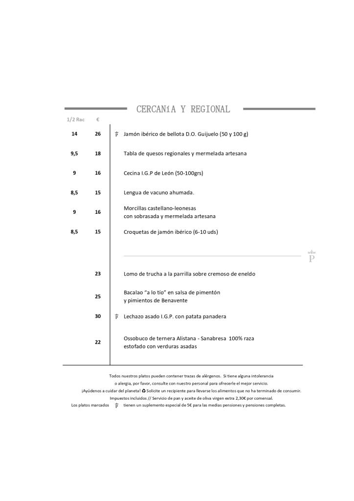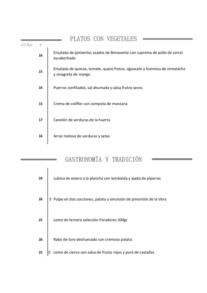 Carta del Restaurante en el Parador