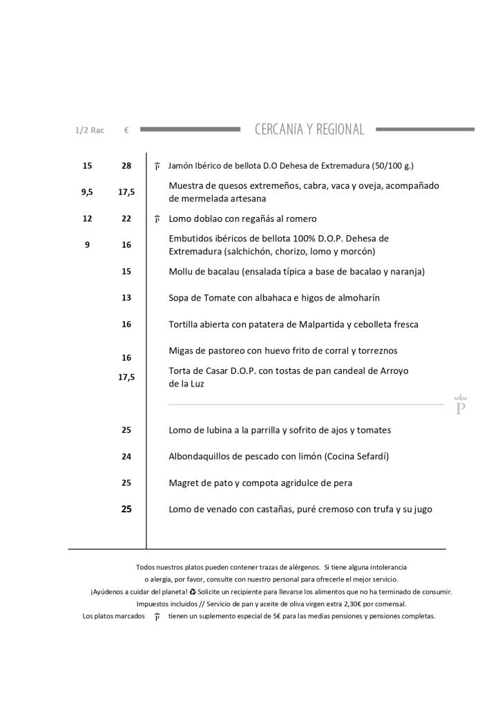 Este mimado conjunto de palacios ofrece una cuidada cocina, basada fundamentalmente en productos extremeños con denominación de origen. Variadas delicias del cerdo ibérico, sin olvidar el tradicional zorongollo (exquisita ensalada de pimientos rojos asados), paletilla de lechazo asada , patatas a lo pobre, cochinillo asado, jamón de la Dehesa de Extremadura