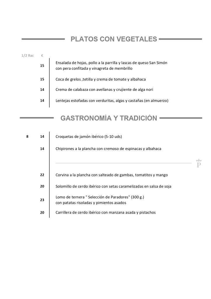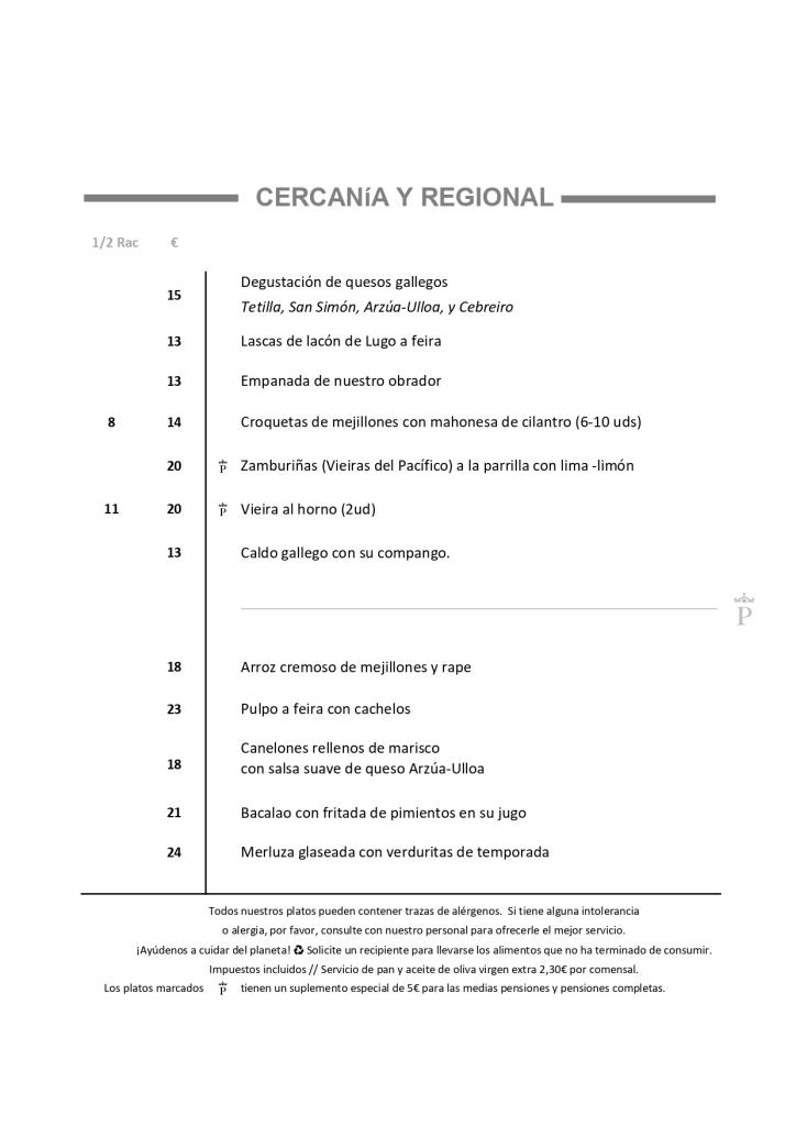 Empanada de Nuestro Obrador, Caldo gallego, lascas de lacón, Pulpo á feira, Sartén de raxo con patatas, Lomo de ternera con pimientos