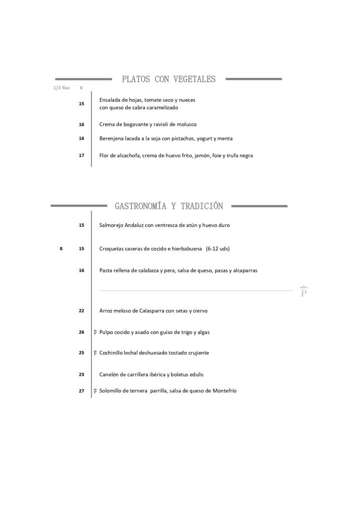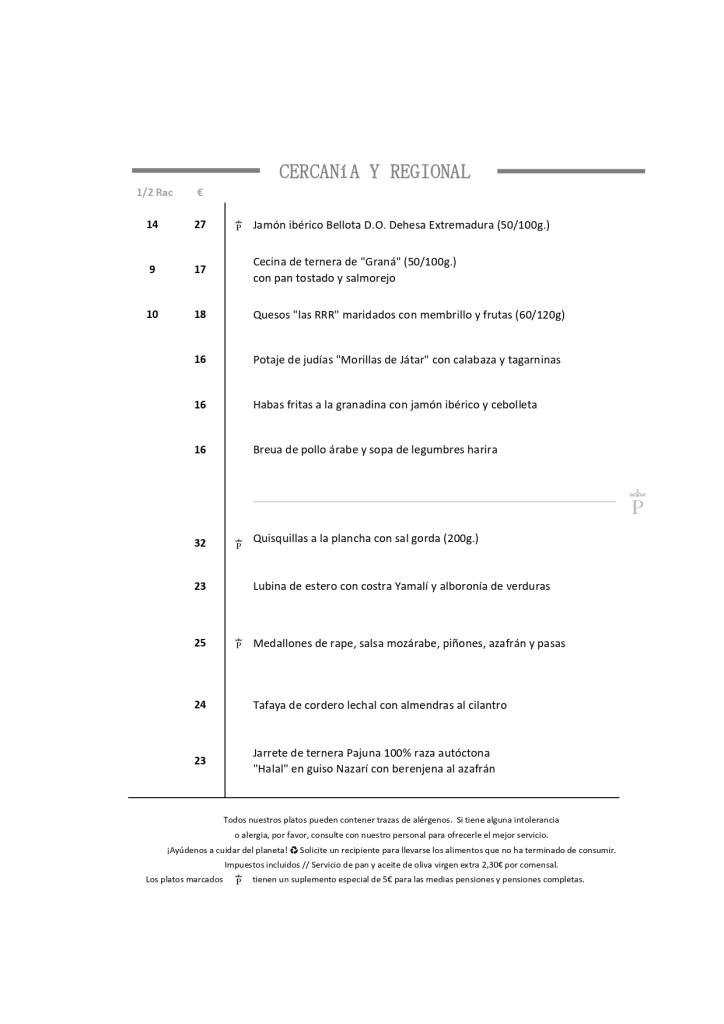 Su carta ofrece especialidades como quesos artesanos, cecina de “Graná”, pollo crujiente en adobo Ras-al-Hanout, pulpo cocido y asado con alboronía, melva de Almadraba, tomate y AOVE de tomillo, salmorejo, breua de pollo nazarí, salaílla de jamón ibérico y tomate…
