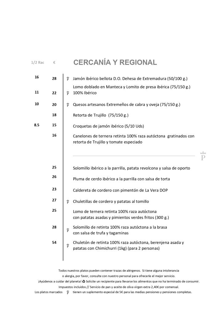 Solomillo de ternera retinta a la parrilla, caldereta de cordero extremeño con tortilla de pan del pastor, solomillo de cerdo ibérico Raza 100% Autóctona con salsa de boletus, repápalos dulces al aroma de ajonjolí.
