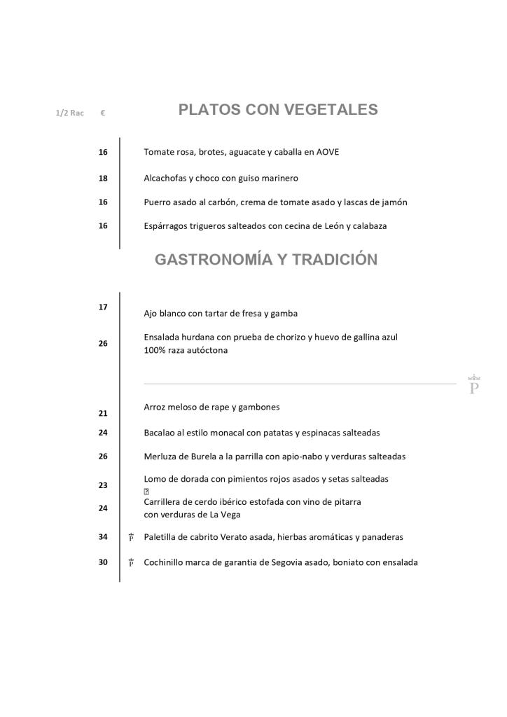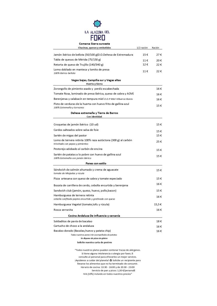 Una carta informal predispuesta al picoteo con propuestas como Jamón ibérico de bellota DO Dehesa de Extremadura, quesos extremeños, paté de perdiz, zorongollo, cardillos silvestres, caldereta de cordero, migas del pastor, soldaditos de pavía de bacalao, choco a la andaluza, bacalao dourado…