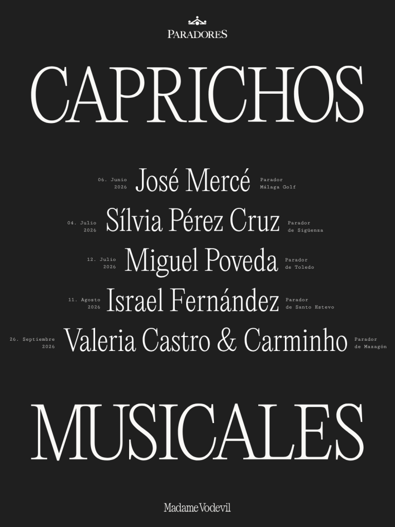 Paradores ha presentado hoy una nueva edición del ciclo de conciertos Caprichos Musicales con un cartel que reunirá a algunas de las figuras más relevantes de la música contemporánea nacional e internacional. José Mercé, Sílvia Pérez Cruz, Miguel Poveda, Israel Fernández, Valeria Castro & Carminho protagonizan esta tercera edición, que se consolida como una de las propuestas culturales y experienciales más singulares del país para este verano. Las entradas saldrán a la venta el próximo lunes 30 de marzo en la plataforma caprichosmusicales.com.