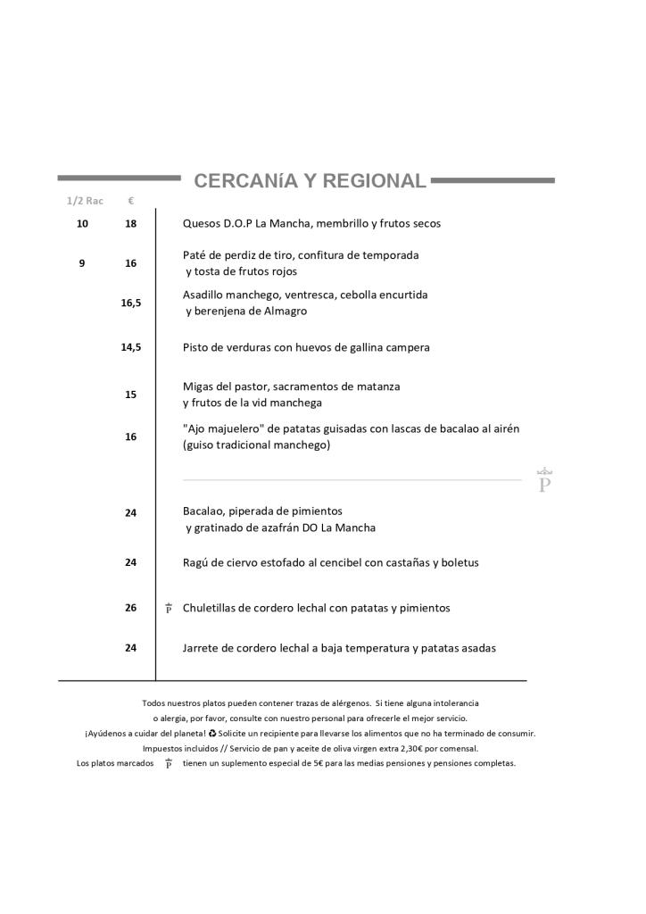 El restaurante dispone de dos comedores: Azafrán, luminoso espacio semicircular heredero del albergue de carretera con tranquilas vistas a los jardines, y Albergue, donde podrás asomarte a bonitos balcones y un porche de madera. En la carta, platos típicos como migas ruleras, gachas, duelos y quebrantos, caldereta, paletilla de lechal manchego, tiznao de bacalao y pisto manchego.