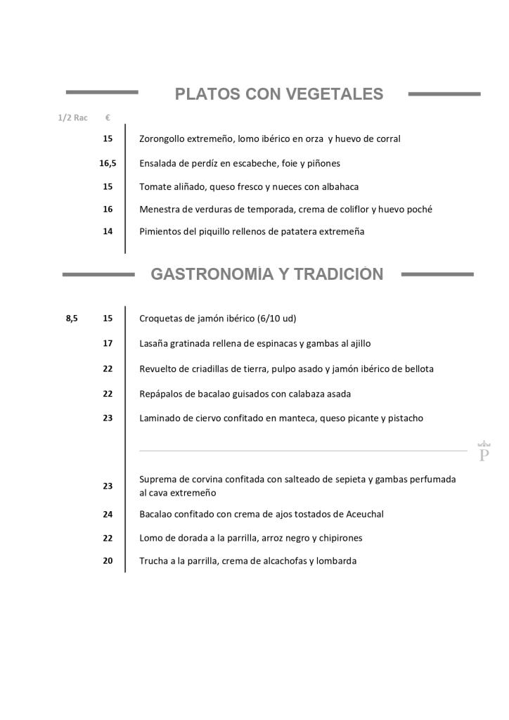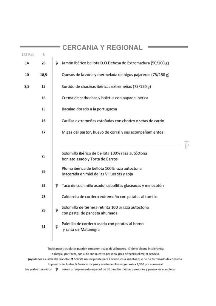 Cazuela de bacalao con pisto extremeño, caldereta de cordero D.O. Corderex, solomillo de ternera retinta, migas del pastor con huevos fritos, chorizo frito y pestorejo (careta de cerdo), dulces del convento y técula mécula.