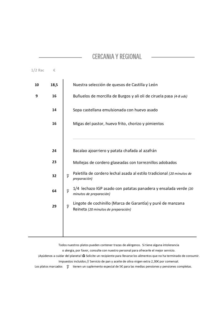 Lomo de bacalao ajo arriero, asado de lechazo churro IGP, cochinillo asado tradicional, así como dulcería artesanal propia.