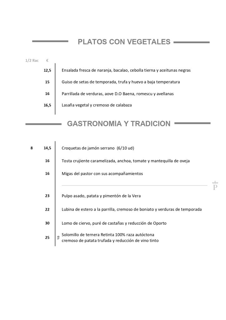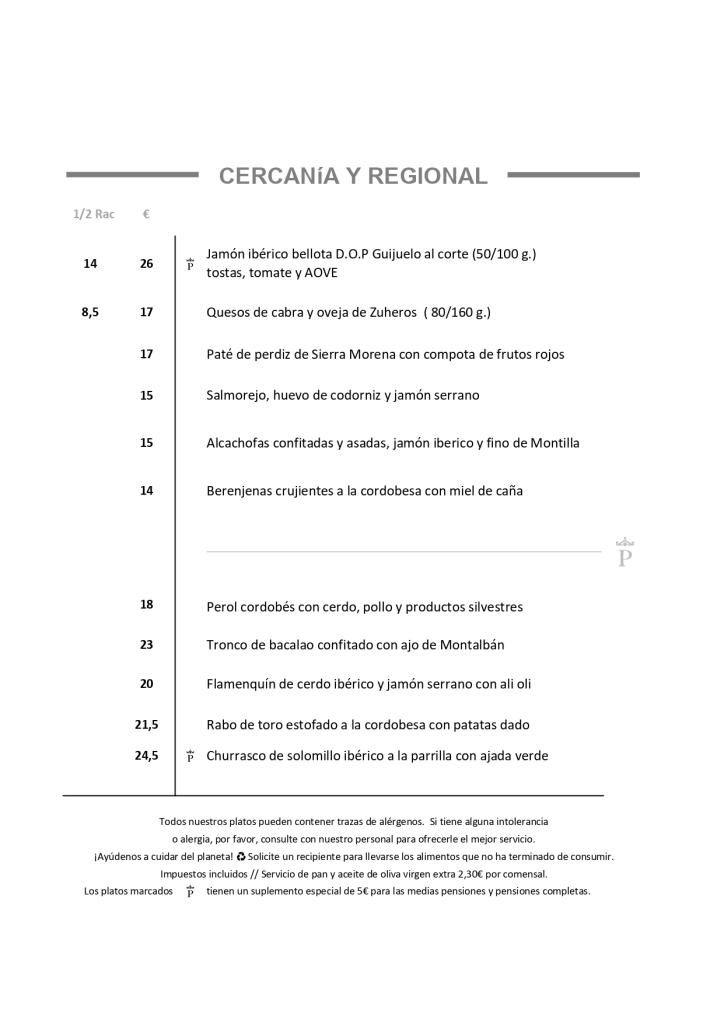 Salmorejo, rabo de toro, flamenquín, berenjenas con miel y sultanas de coco.