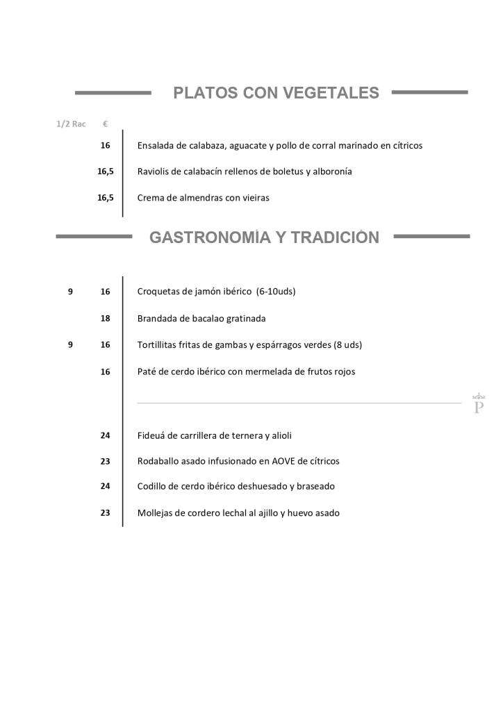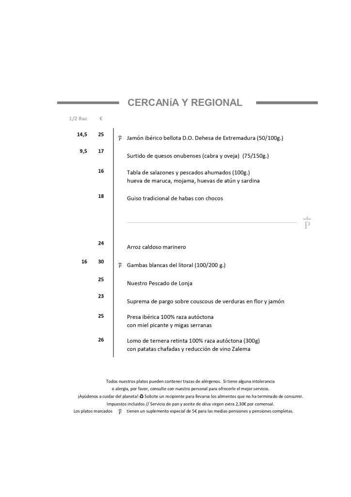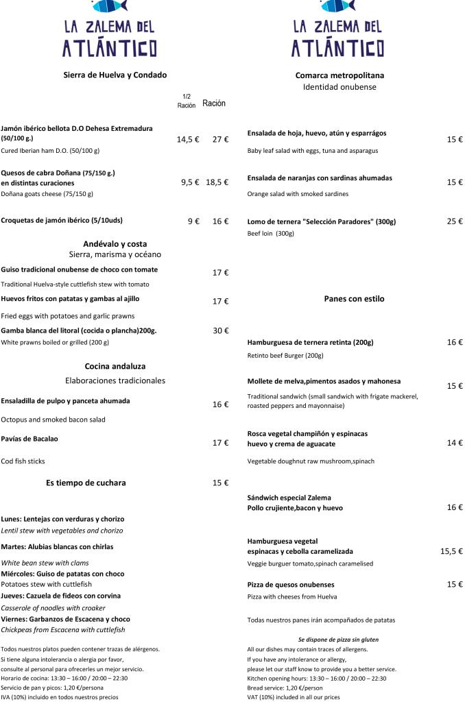 Carta del Espacio Gastronómico La Zalema del Atlántico en el Parador de Mazagón