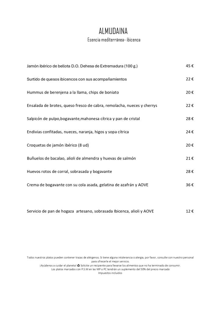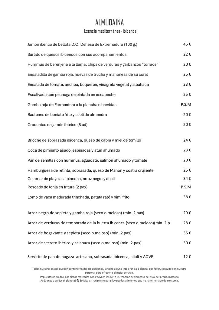 Le restaurant Almudaina propose une expérience gastronomique séduisante, inspirée de la cuisine méditerranéenne et des racines ibicencas. Les produits locaux et de saison constituent la base d'une carte qui réinterprète les recettes traditionnelles avec une touche de modernité, mettant en valeur la richesse du terroir. Les plats à base de fruits de mer, comme les crevettes rouges de Formentera et le poisson frais du marché, sont particulièrement remarquables, tout comme des ingrédients typiques tels que la sobrasada d'Ibiza.