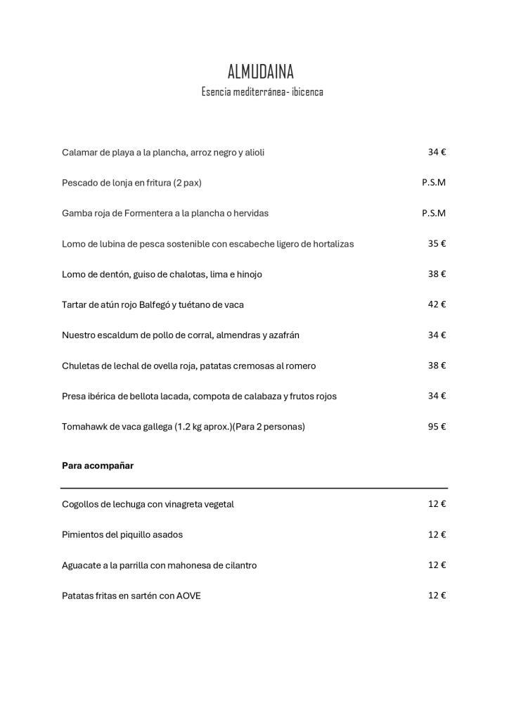 Crevettes rouges de Formentera grillées ou bouillies, riz noir aux seiches et aux crevettes rouges (sec ou crémeux), calamars de plage grillés avec riz noir et aïoli, poulet fermier escaldum aux amandes et au safran.