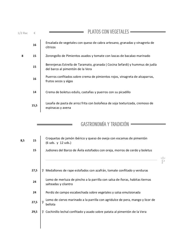 Zorongollo de poivrons rôtis et tomates, migas del pastor avec œuf à l’étouffée avec du lard frais et du chorizo, soupe de cerises Valle del Jerte (saisonnier), steak d’aloyau et chevreau verato.