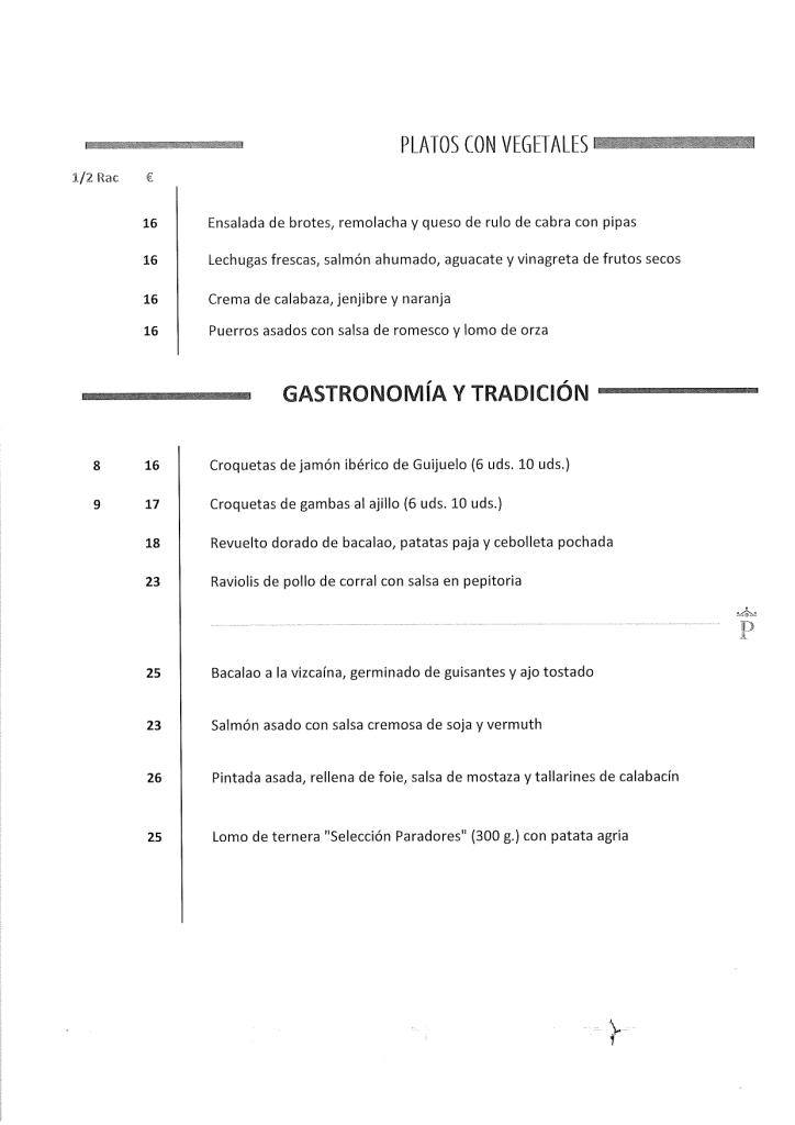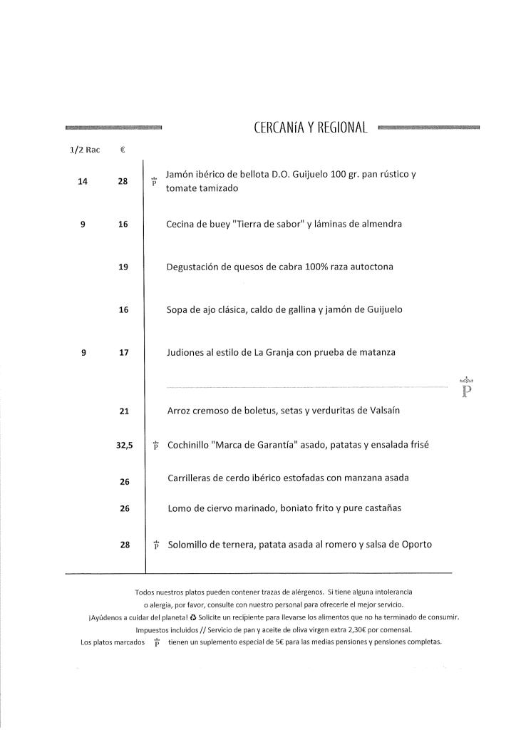 Judiones de La Granja, cochinillo MG asado con patatas y ensalada alineada, ración de cordero lechal IGP confitado, patatas encebolladas y ensalada, ponche segoviano (con mazapán y yema blanda).